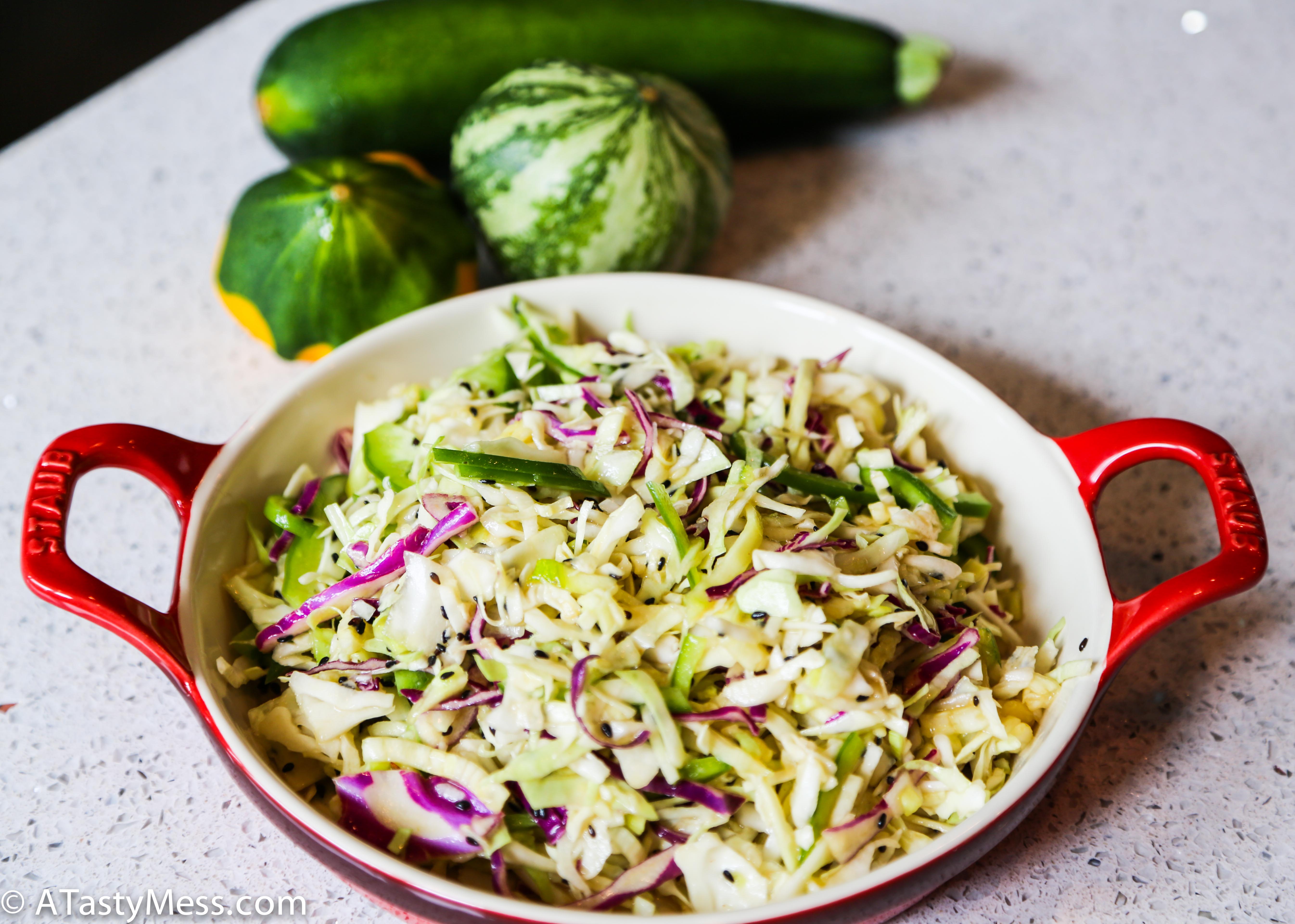 - Combine dressing ingredients (except sesame seeds) and whisk until blended well. Combine the dressing with the coleslaw, zucchini, and sesame seeds and mix well.