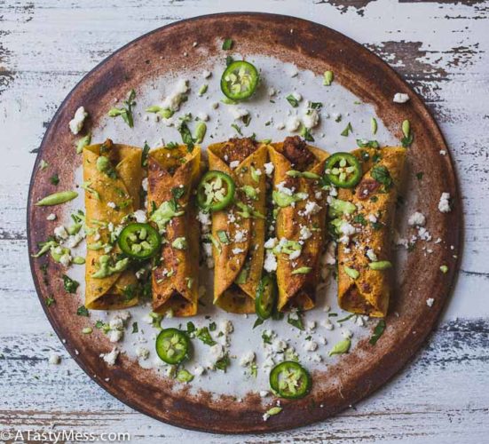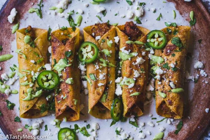 - Plate the taquitos and, top with garnishes and avocado crema. Serve warm or reheat later in your oven on broil. Enjoy!