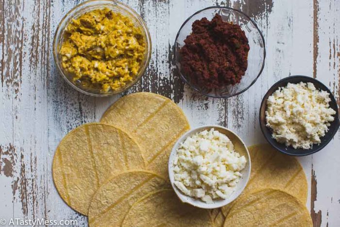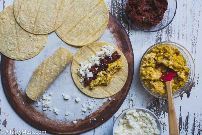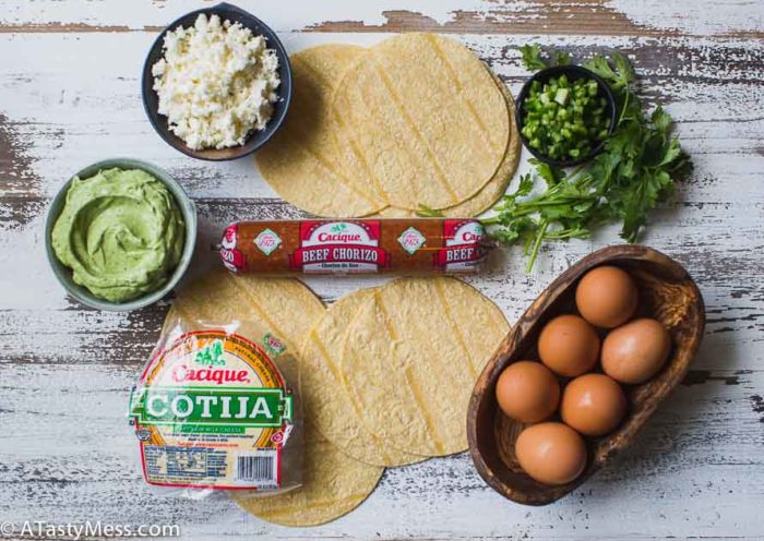 - Have your assembly line ready - the Cacique Beef Chorizo, the eggs, and the Cacique Cojita Cheese. Heat the corn tortillas for about 20 seconds in the microwave until they are pliable and soft. Quickly fill each tortilla with about a teaspoon of chorizo, a tablespoon of eggs, and a teaspoon of cheese. Roll each tortilla up while they are warm and lay them seam side down on a plate. Don’t overfill the tortillas.