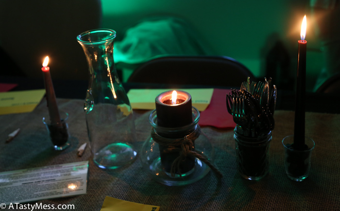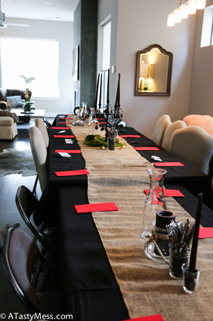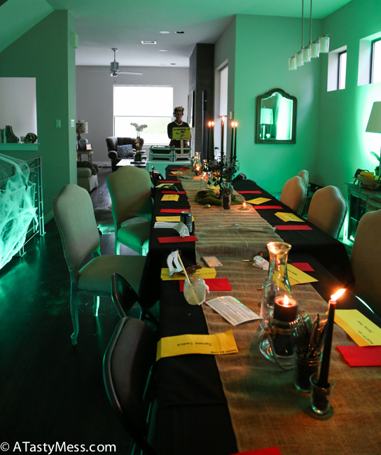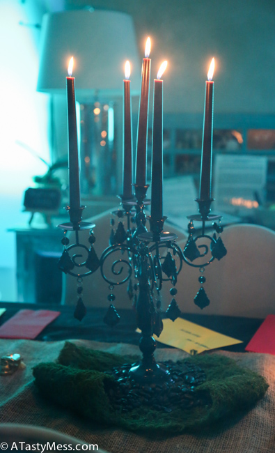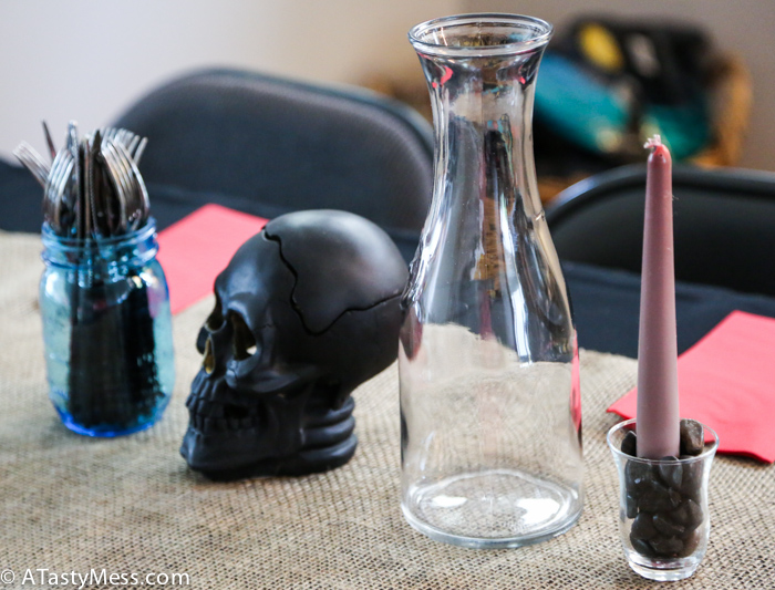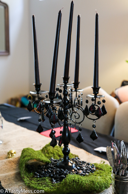 Michael’s – Black candelabra, burlap table runner, black river pebbles, green moss, black candle, fake skulls, skull candles, fake cobwebs, 3 tiny baskets for the different rounds of clues, and 3 tiny chalkboards to label which round the clues were for. (You can always buy some of this stuff way before Halloween or post to get them on clearance)