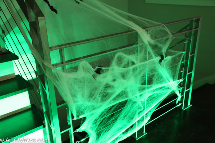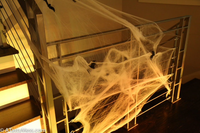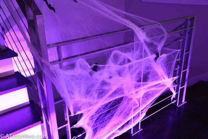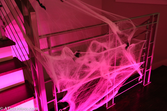 I throw a few parties a year, so what I do is save ALL of these things once the party is done – I wrap up the table runner (and just wipe off the crumbs of food), bag up the river pebbles, bag the moss, the cobweb, basically anything and everything including half burned candles – and use for my next party. It is a great way to save money, AND all of the décor keeps adding up for an even better party the next time.