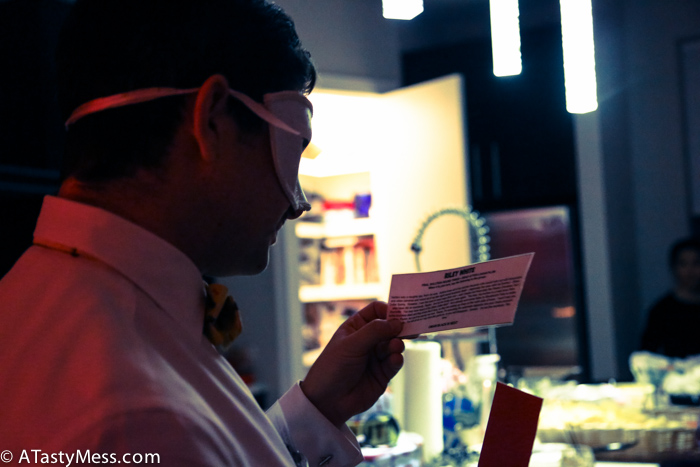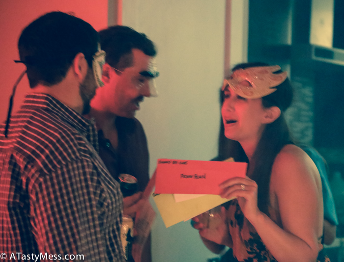 The process I went through setting up the clues: First I printed, laminated, cut, and then placed all of the clues in different colored envelopes according to rounds. Then, I made sure all the name cards were laminated, cut, and tagged with a clip, and placed them in the entry way for guests to put on as they arrived. I then instructed everyone when to pick up each clue and what to do with them. IMPORTANT: The directions of the party can get a bit overwhelming, so it is extremely important to make sure you read the instructions VERY carefully, and explain it as clearly as you can to everyone. If I had the evening to do over again, I would have actually emailed everyone their first clue the day before – the first clue is a bit lengthy – this way everyone could have read it through before the party, rather than stressing when they got there about memorizing. Either way, it worked out really well, it just took people a few minutes to read once they arrived.