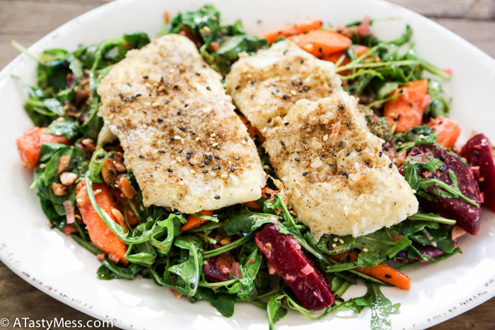 Oh hey, here I am with my dukkah spiced cod & warm beet, carrot, & arugula salad…. no big deal… I just made that :).