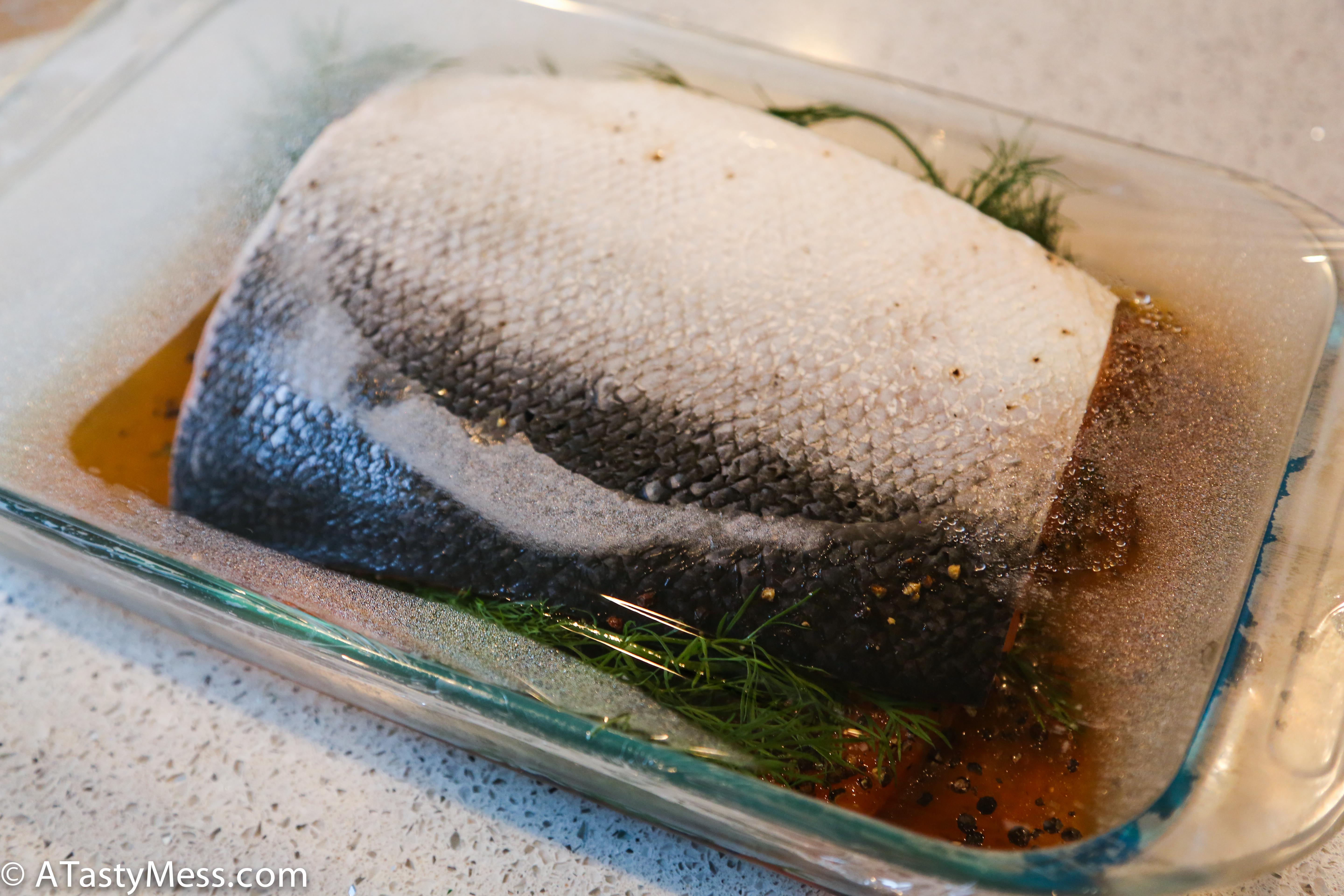 - Remove the dill and brush seasoning off with hand. If need be, wet hand a little to get the excess off (do not let water hit the surface directly - I use a wet paper towel and GENTLY rub the excess off). Place both halves of the salmon skin side down on paper towels, then place on a tray and refrigerate for 48 hours. Make sure the salmon is not covered, it needs to dry.
