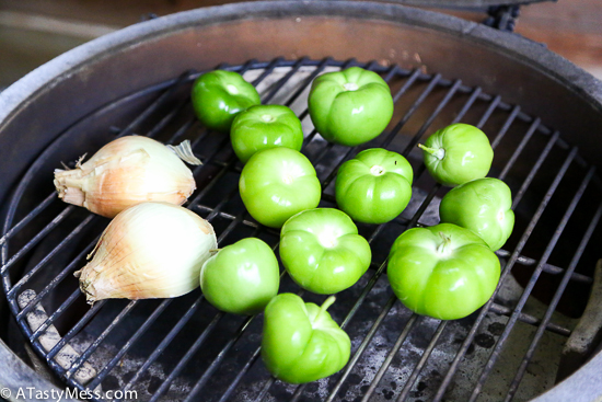 - Preheat your grill to 400 degrees F. Place whole tomatillos and 1 onion on the grill and cover. Cook for about 5-7 minutes on each side, until it browns. Remove and set aside. Chop the onion up for the next step.
