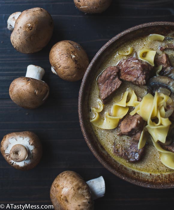 Unlike other stroganoffs which come out a bit thicker, I didn’t use any flour or corn starch to thicken this, and I loved the end result. My main reasoning for this was that I am dieting and wanted to cut calories. So, if you aren’t worried about that (and truly, it isn’t many more calories), and would like a thicker broth it’s a simple solution. Mix corn starch or flour and some of the broth in a separate container, then stir it back in, and cook for an additional 15 minutes or so. You can adjust the amount of corn starch you use to achieve a thicker constancy.