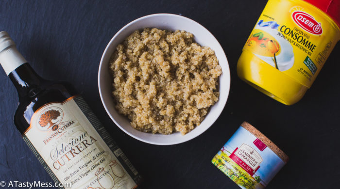 - Begin by rinsing your quinoa really well. Fill a small saucepan with quinoa, water, salt, and consomme. Bring to a gentle simmer and cover the pot first with a paper towel, and then with the lid. Turn heat all the way down to low, and lightly simmer/steam the quinoa for 15-17 minutes, until ready. Once the quinoa is done, drizzle 1 tsp. of olive oil on top and add additional salt if desired.