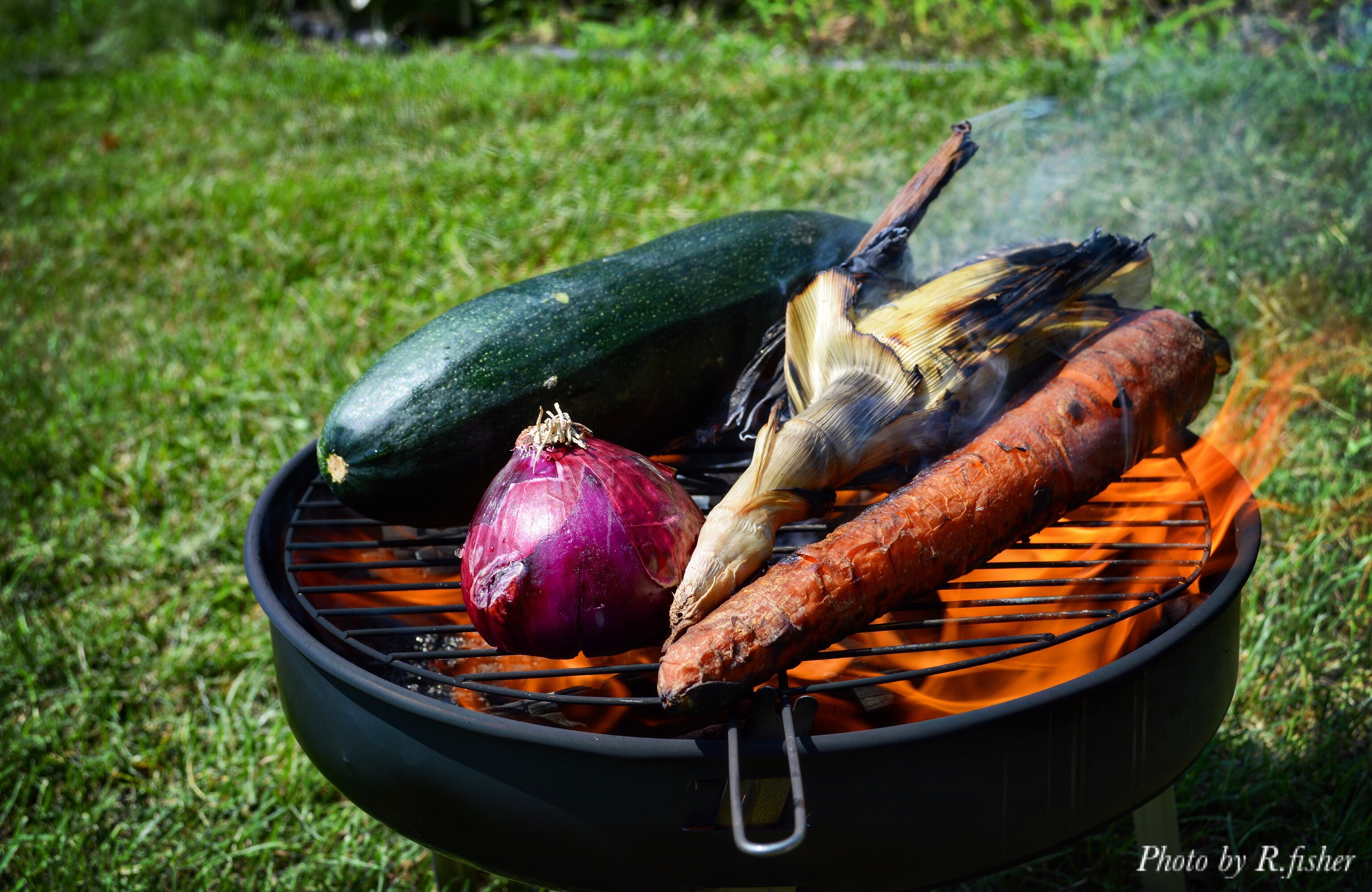 Next it’s time to decide whether you want everything grilled or oven roasted, and to what degree. I bought roasted and buttered corn from my favorite farm stand; then flame roasted my onions, pepper, and carrots—the zucchini I kept raw….