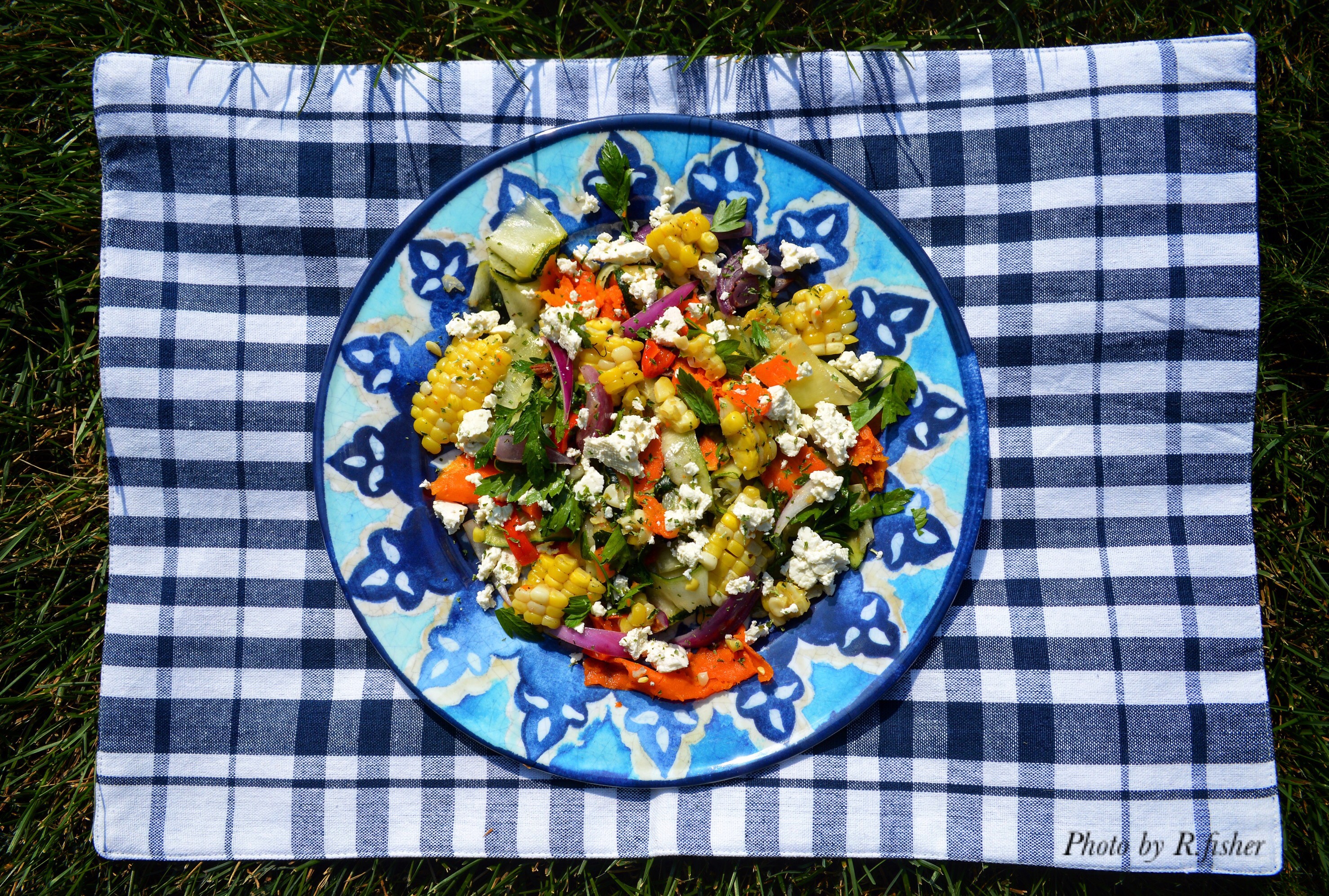 Finally I went to town with one of my trusty Shun knives and a vegetable peeler; making ribbons of zucchini and carrots, slicing onions and peppers, and removing all of that delicious corn from the cob….
