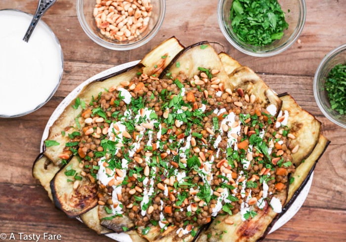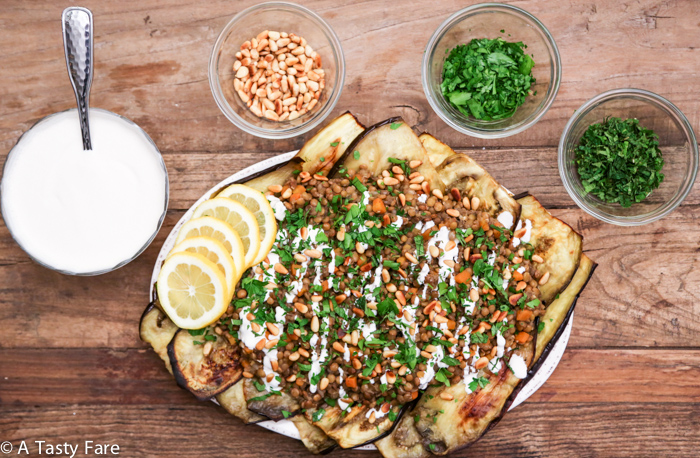 - To put it all together begin by layering eggplant in a medium size serving dish. If you used two eggplants, you will have about 2-3 layers. Top with lentils, tahini, herbs, pine nuts, and lemon zest. Option here to serve with lemon wedges.