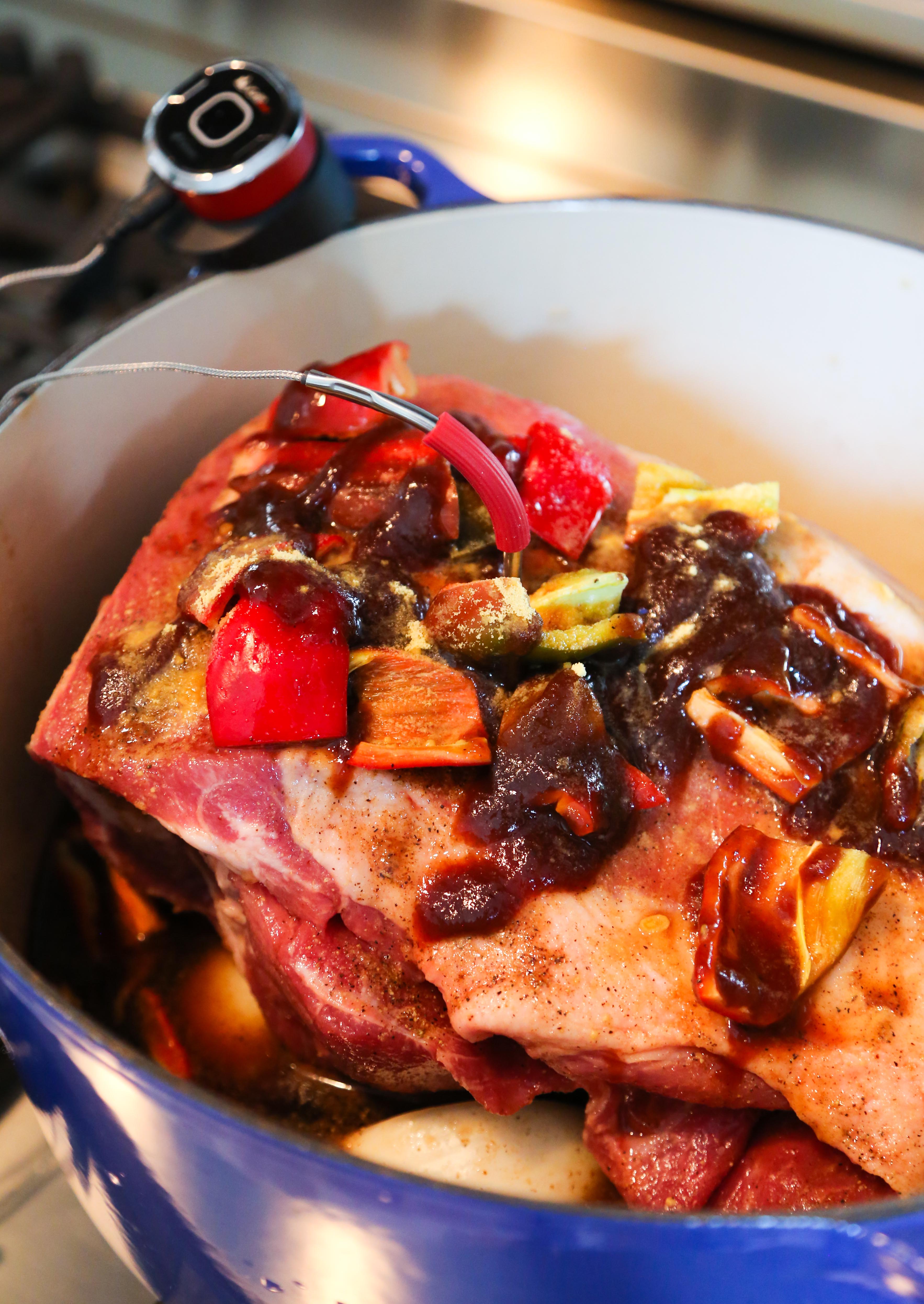 The hardest part of this recipe was having the will power to keep the oven door closed for 5 hours with the smell of heaven seeping through the door. This has to be one of the easiest, most amazing pork recipes I have ever made. The meat is so tender, I picked up a piece with my fork and half of it fell back down to the plate… I’m having trouble not eating the whole thing. Plus… thanks to the iGrill mini thermometer I was able to go about doing everything else I needed to do without having to monitor the temperature once!