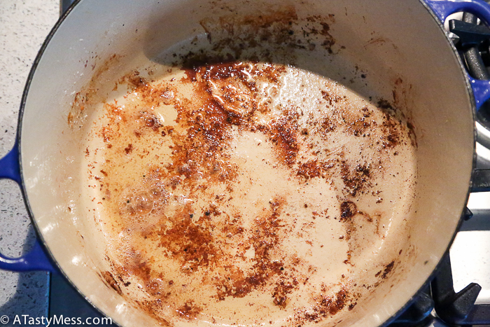 One of the other important aspects to this dish is browning the meat. It is crucial to brown the meat and get these really good brown bits onto the bottom of your pan – this is the “flavor goop” as I like to call it.