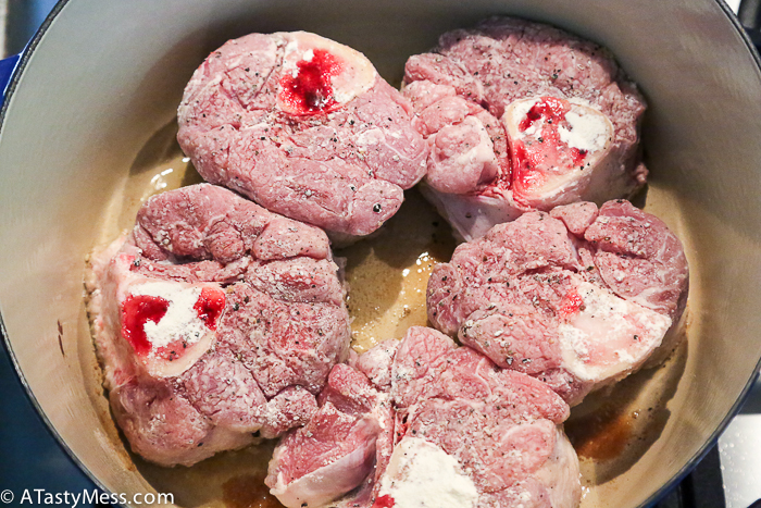 - Place the flour in a small breading dish and set aside. Season both sides of the veal and lamb shanks very well. Then coat all sides evenly with the flour and set aside. Prepare a medium-large cast iron pot - heat the olive oil in the pot on high. Add in the veal and lamb shanks and sear on all sides until golden brown, about 15-20 minutes total. Remove the shanks and lower the heat to medium.