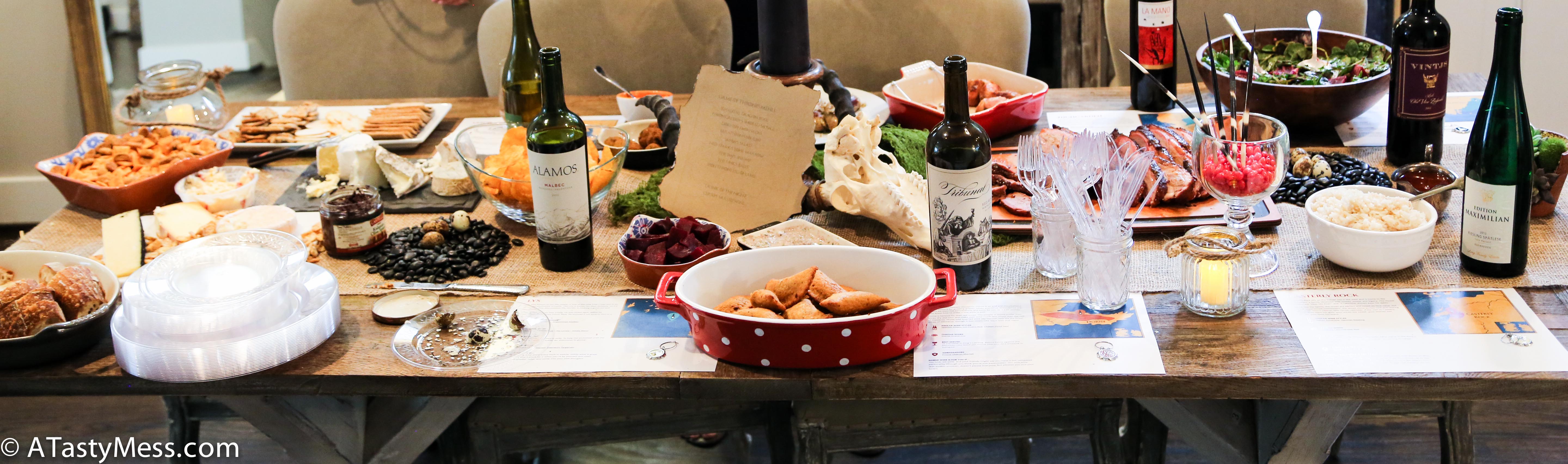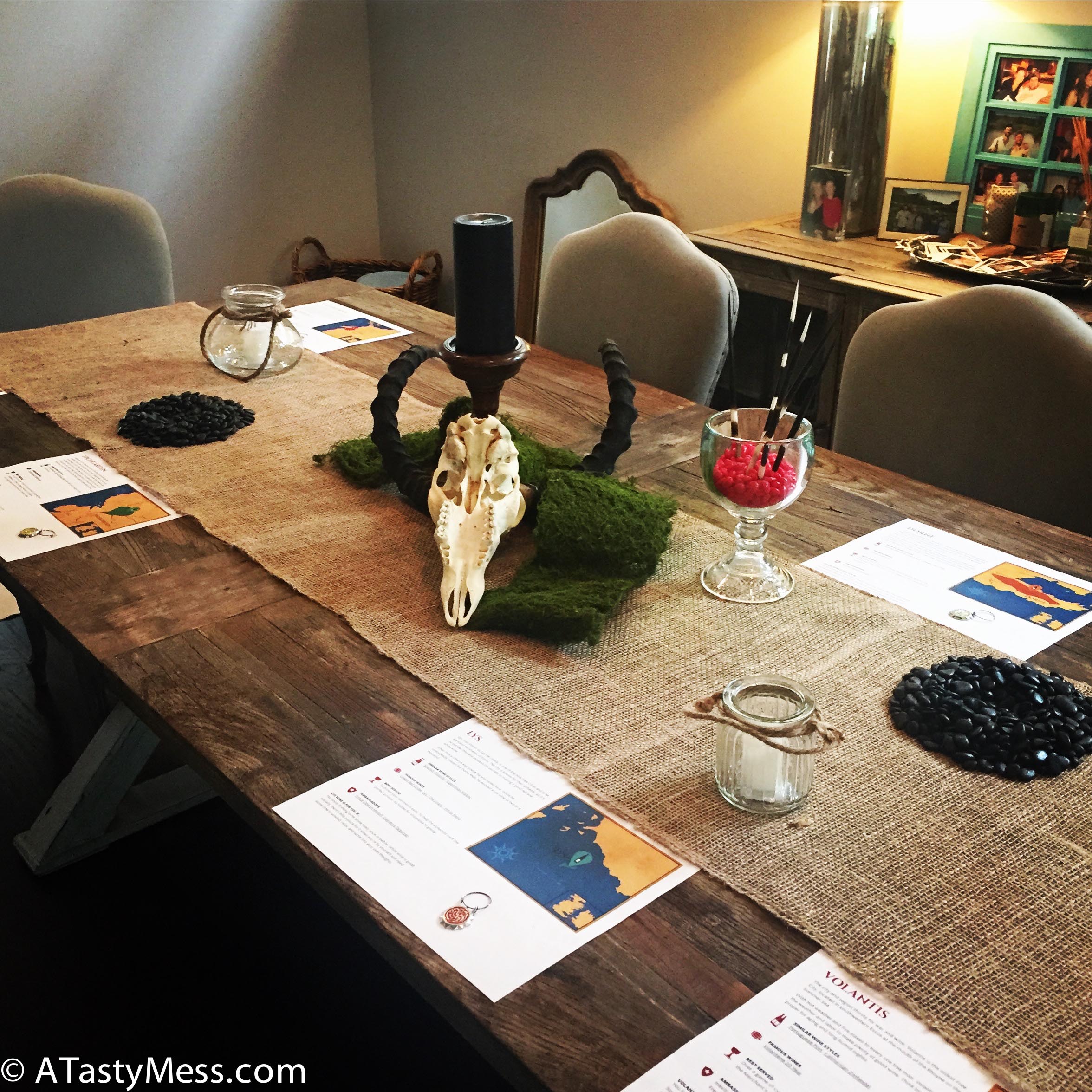 For the table decor, I got everything from Michael’s pretty much. It was all really inexpensive, as they always have great coupons, I only spent about $30. I put burlap table runners down first, then layered with a rustic candle holder and black candle that bled, and put some moss around that. They also had some really pretty glass candle holders with rope around them that I bought, and placed switch light tea candles inside. I had a really cool skull already at home from Africa, but you can buy them here on eBay. I also bought from his store porcupine quills, which I used in the glass with candy (some people actually did poke themselves which gave me a good giggle). I used the vivino’s “The Wines of Game of Thrones” list, and paired with cheap wines (all around $6) from Trader Joe’s. I also bought small black rocks from Michael’s to put the “dragon eggs” on.